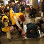 這次夜訪街友最小的義工才10歲,跟著爸爸來到現場,熱心地對每一位寒士朋友說「阿彌陀佛」,然後將一袋又一袋的物資遞到他們的手上。