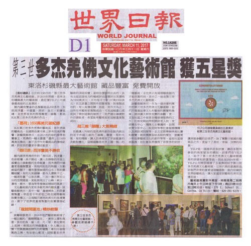 2017-0311世界日報第三世多杰羌佛文化藝術館榮獲美國YELP網站頒發頂級五星獎狀