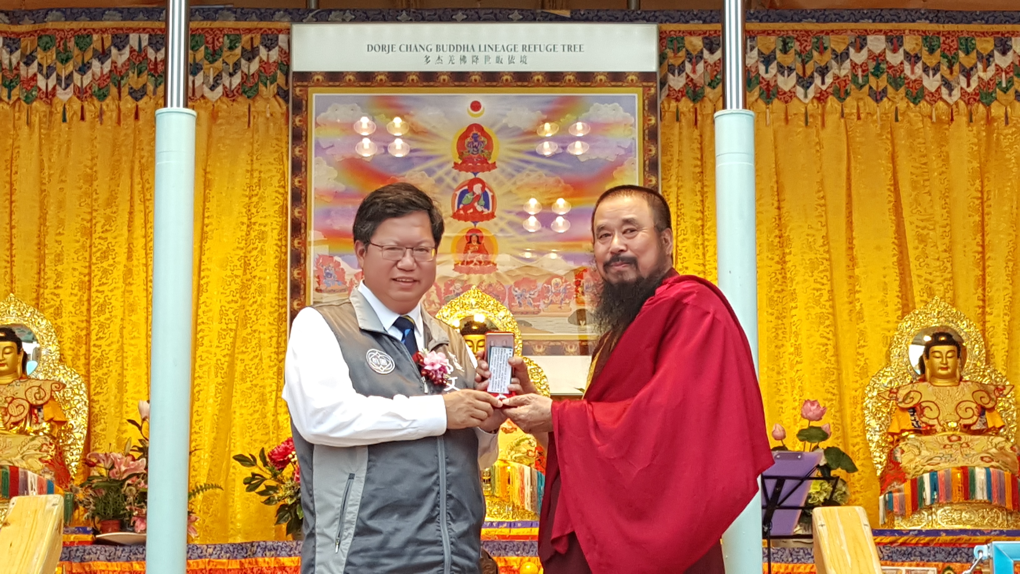 - 世界佛教正心會主法上師恆性嘉措仁波且致贈綠度母墜子給桃園市長鄭文燦先生