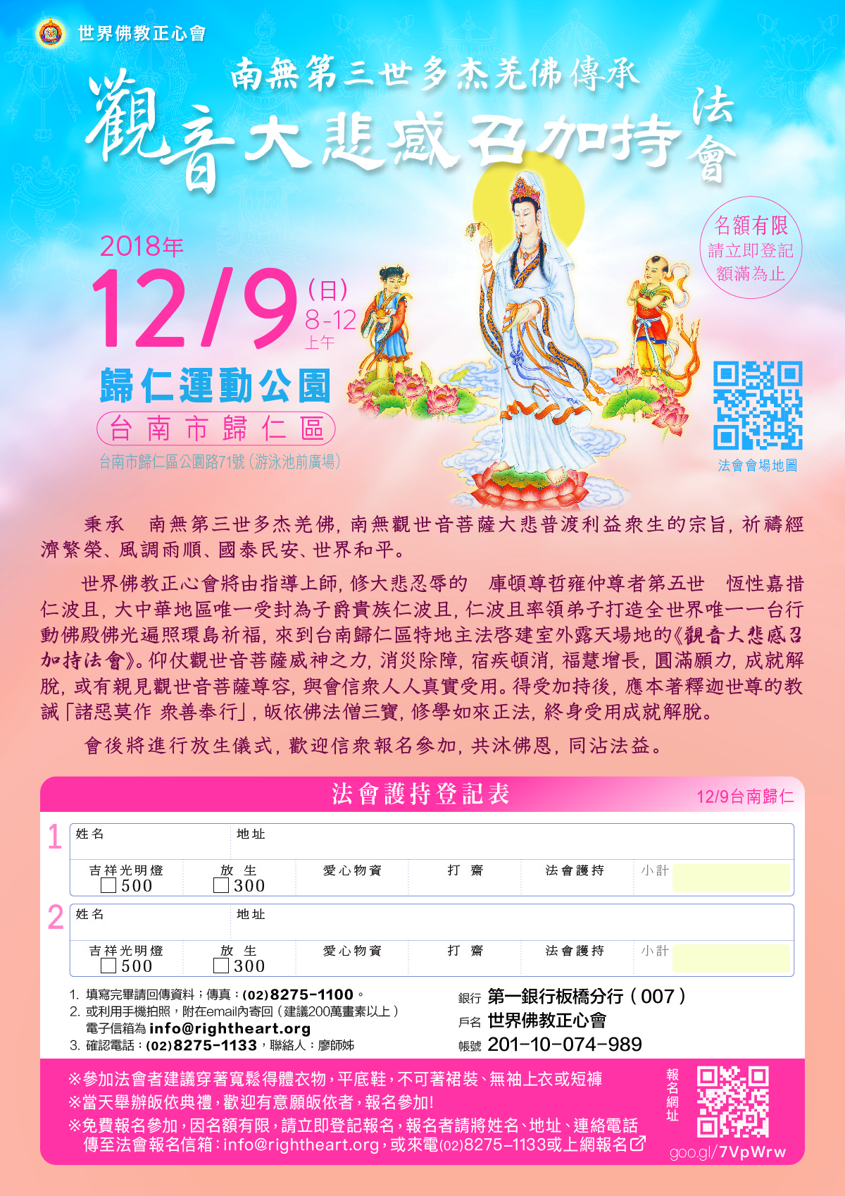 該會特別在12月9日在歸仁區游泳池前廣場舉辦「觀音大悲感召加持法會」,仁波且秉承 南無第三世多杰羌佛的傳承力,恭請 觀世音菩薩親臨壇場為大家做加持,由於觀音大悲加持法是觀音大悲心積聚之力,因此加持之後,上師將會帶領大眾放生結行,法會殊勝無比,歡迎各位善信邀請親朋好友一同參加! 三場祈福法會的時間地點:
