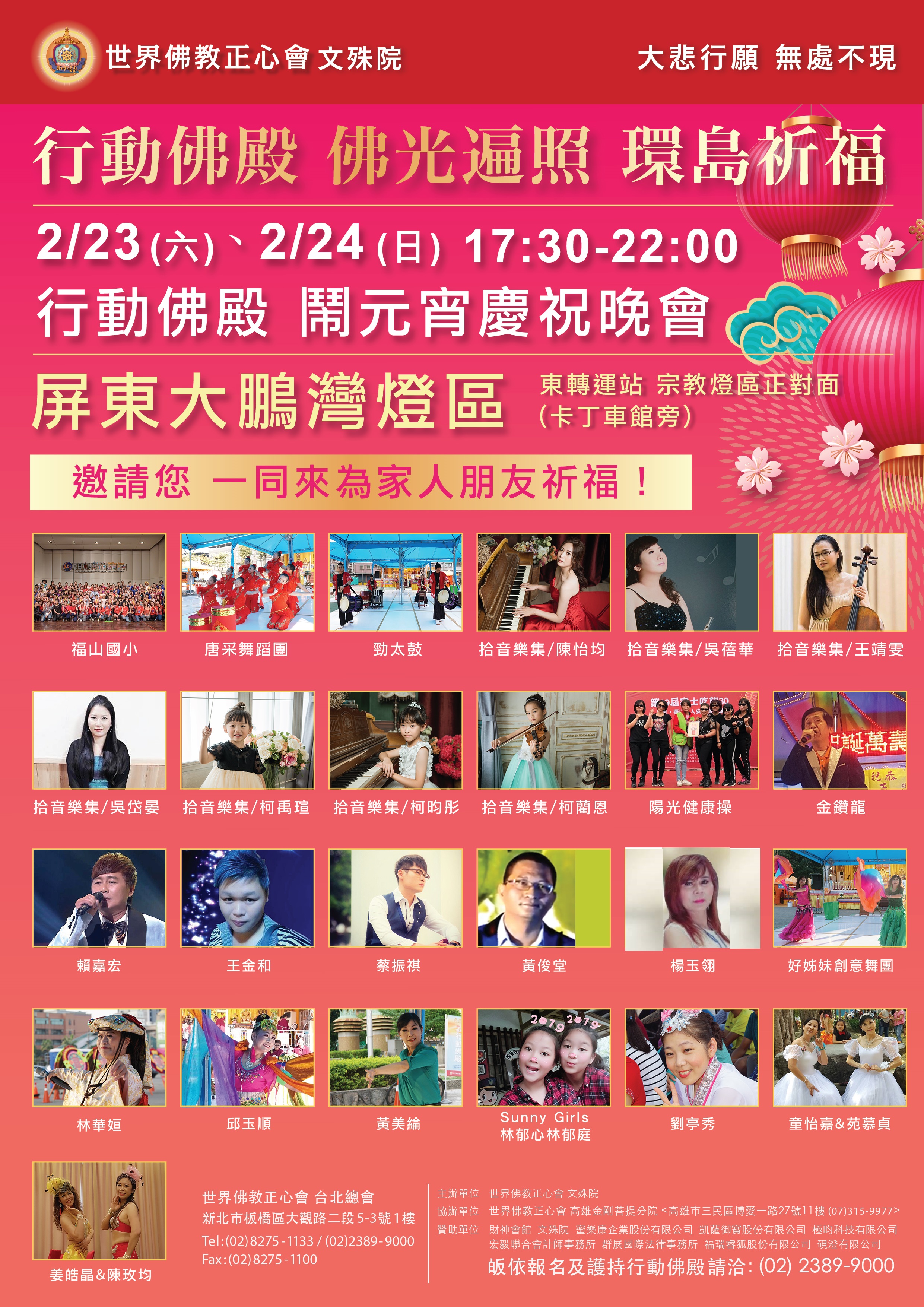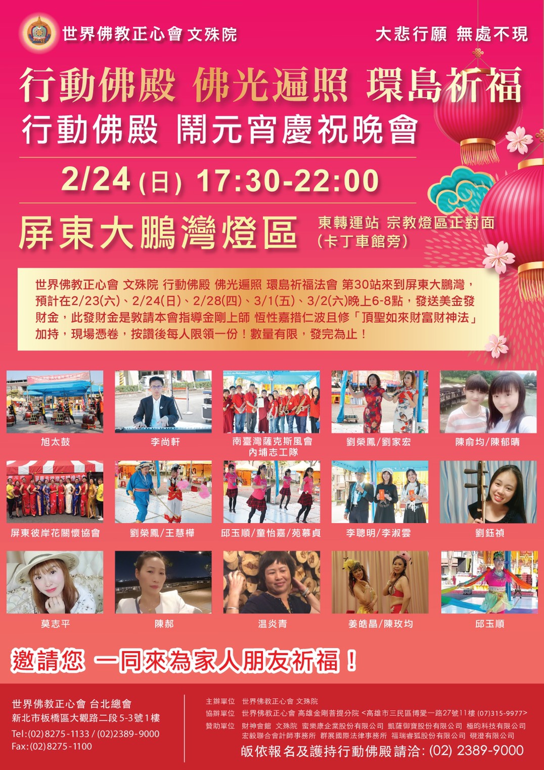 - 世界佛教正心會 行動佛殿 佛光遍照 環島祈福法會第30站來到屏東大鵬灣台灣燈會,邀請表演團體來到燈會現場樂藝供佛,參與難得殊勝勝會