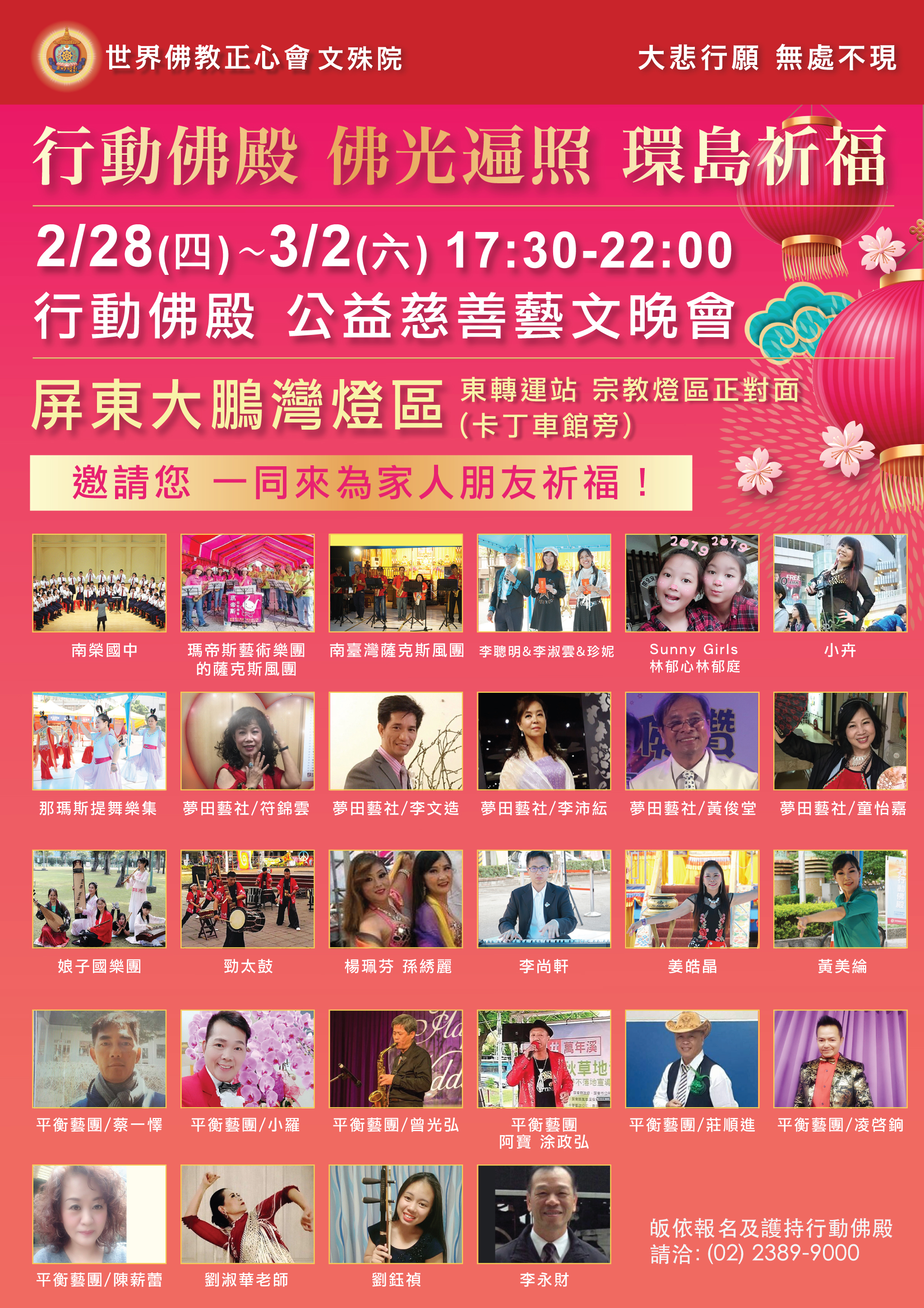 連假三天的晚上,邀請全台灣優秀的表演藝術家們,一同在行動佛殿前樂藝供佛,歡迎大家在連續假期來到大鵬灣,與我們越夜越美麗!表演節目包羅萬象,有震撼人心的勁太鼓、優雅的那瑪斯提舞悅集、南台灣薩克斯風協會內埔志工團、娘子國樂團、國際身障大賽鋼琴金牌的李尚軒、Sunny Girls林郁心&林郁庭少女熱舞、瑪帝斯藝術樂團-薩克斯風團、歌手小啟田(李聰明) &李淑雲 &珍妮&小卉、南榮國中58人口琴團、黃美綸佛拉明哥舞蹈、二胡劉鈺禎 、肚皮舞姜皓晶、歌手李永財、舞蹈楊珮芬&孫綉麗、夢田藝社、平衡樂團,歡迎大眾連假到屏東大鵬灣台灣燈會行動佛殿觀看精彩演出喔!
