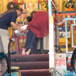 - 屏東縣以栗國小校長洪美珠(右)及蔡俊賢教練(左)率領學生在東港東隆宮表演直排輪舞龍,恆性嘉措仁波且(中)加持綠度母墜子,此為2008年環島拜佛圓滿後的加持物。