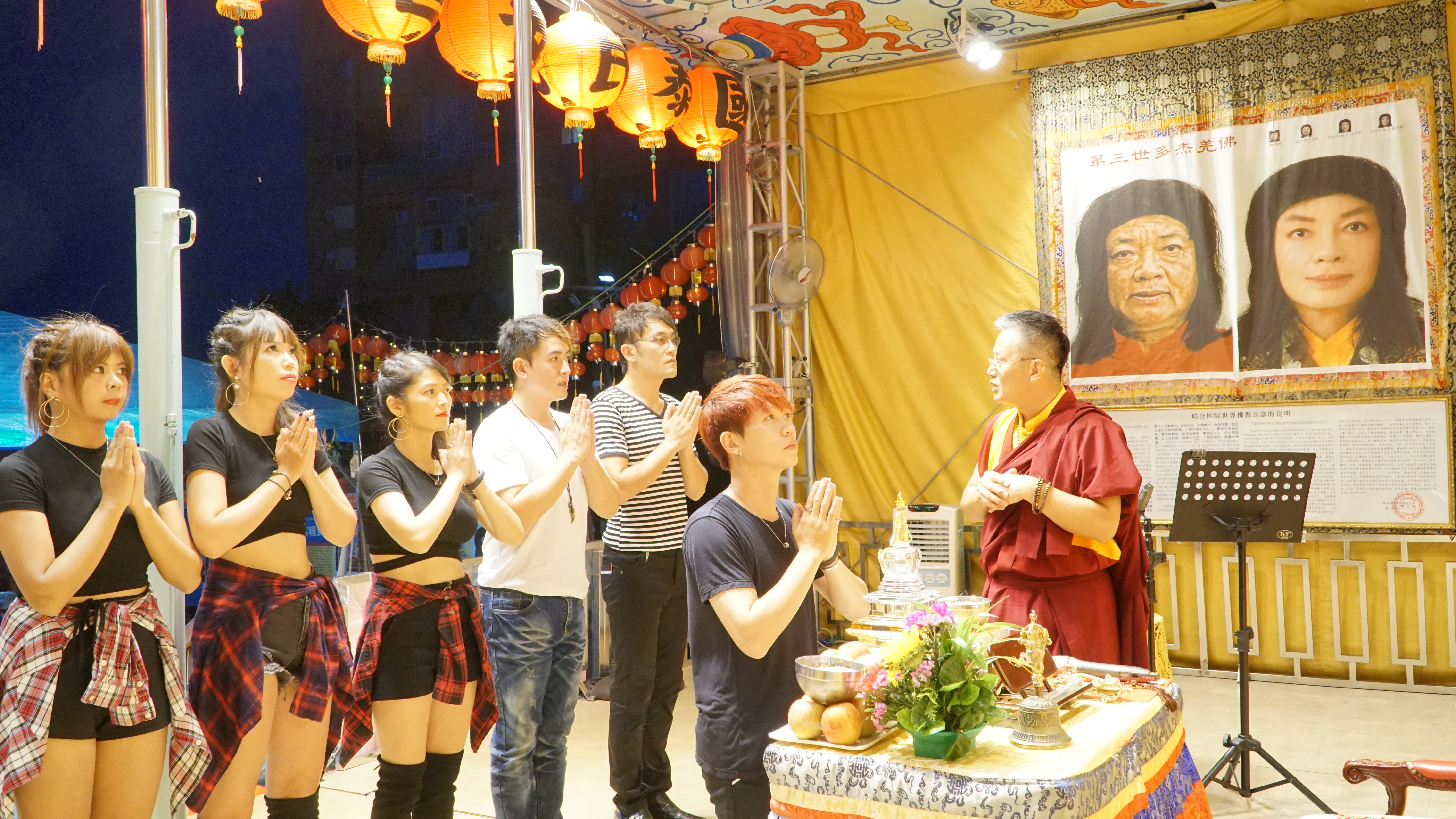 - 蘭陽表演藝術推廣協會的多位表演者於演出前先上佛殿禮佛