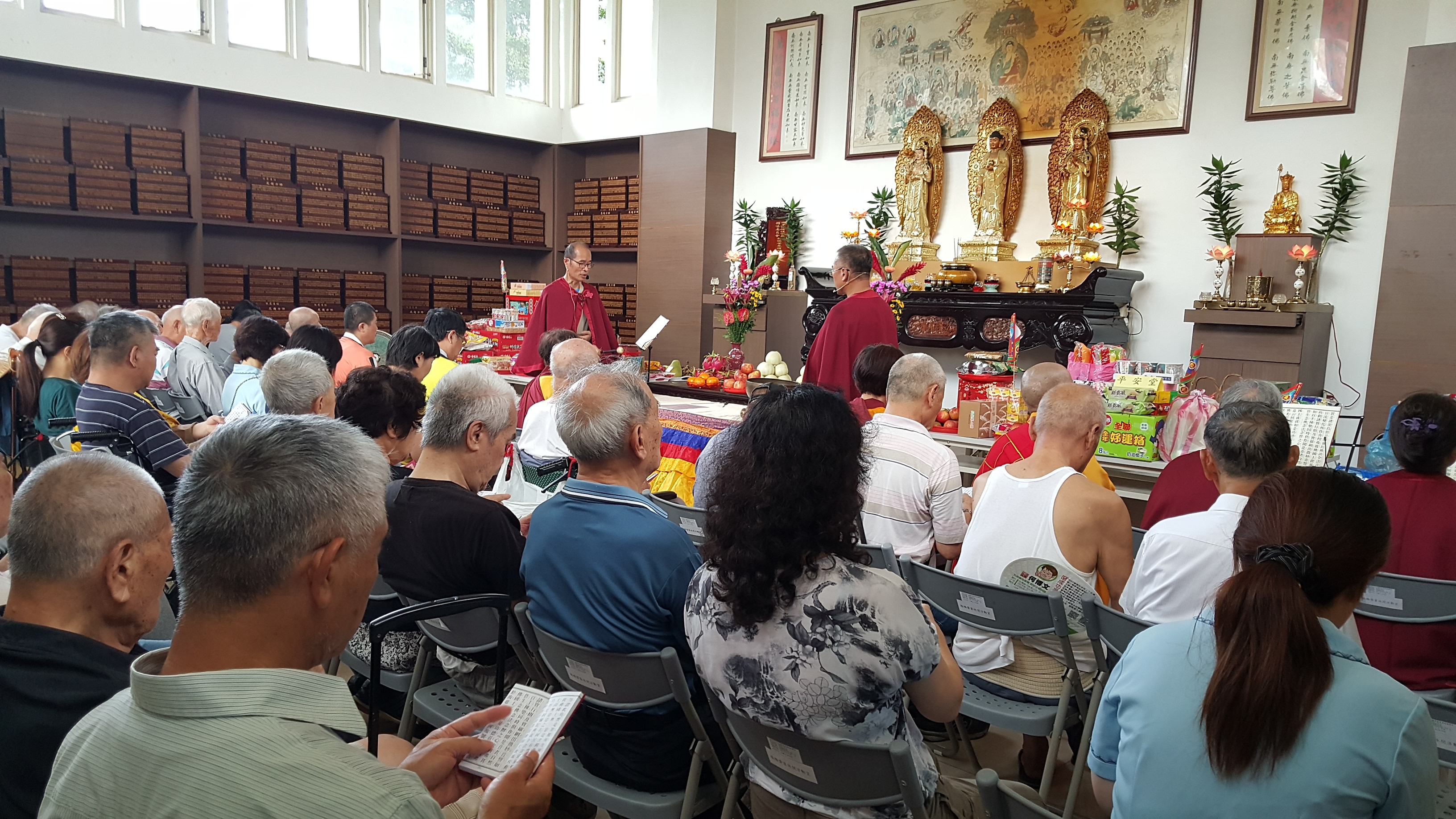 本會師兄姊們帶領爺爺奶奶們恭誦「佛說阿彌陀經」,經云「其國眾生無有眾苦但受諸樂,故名極樂」,「彼佛光明無量,照十方國,無所障礙,是故號為阿彌陀」,「彼佛壽命及其人民,無量無邊阿僧祇劫,故名阿彌陀佛」,「若有善男子、善女人聞是經受持者及聞諸佛名者,是諸善男子、善女人皆為一切諸佛所護念,皆得不退轉於阿耨多羅三藐三菩提」。室外烈日當空非常炎熱,室內卻因往者的忠心,生者的愛心,加上師兄姊們的用心,散發出溫馨祥和的氛圍。