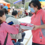 - 世界佛教正心會行動佛殿68站新竹關西潮音禪寺前廣場,弱勢家庭來到佛殿誦經後領取愛心物資,佛墜帶回與家人分享