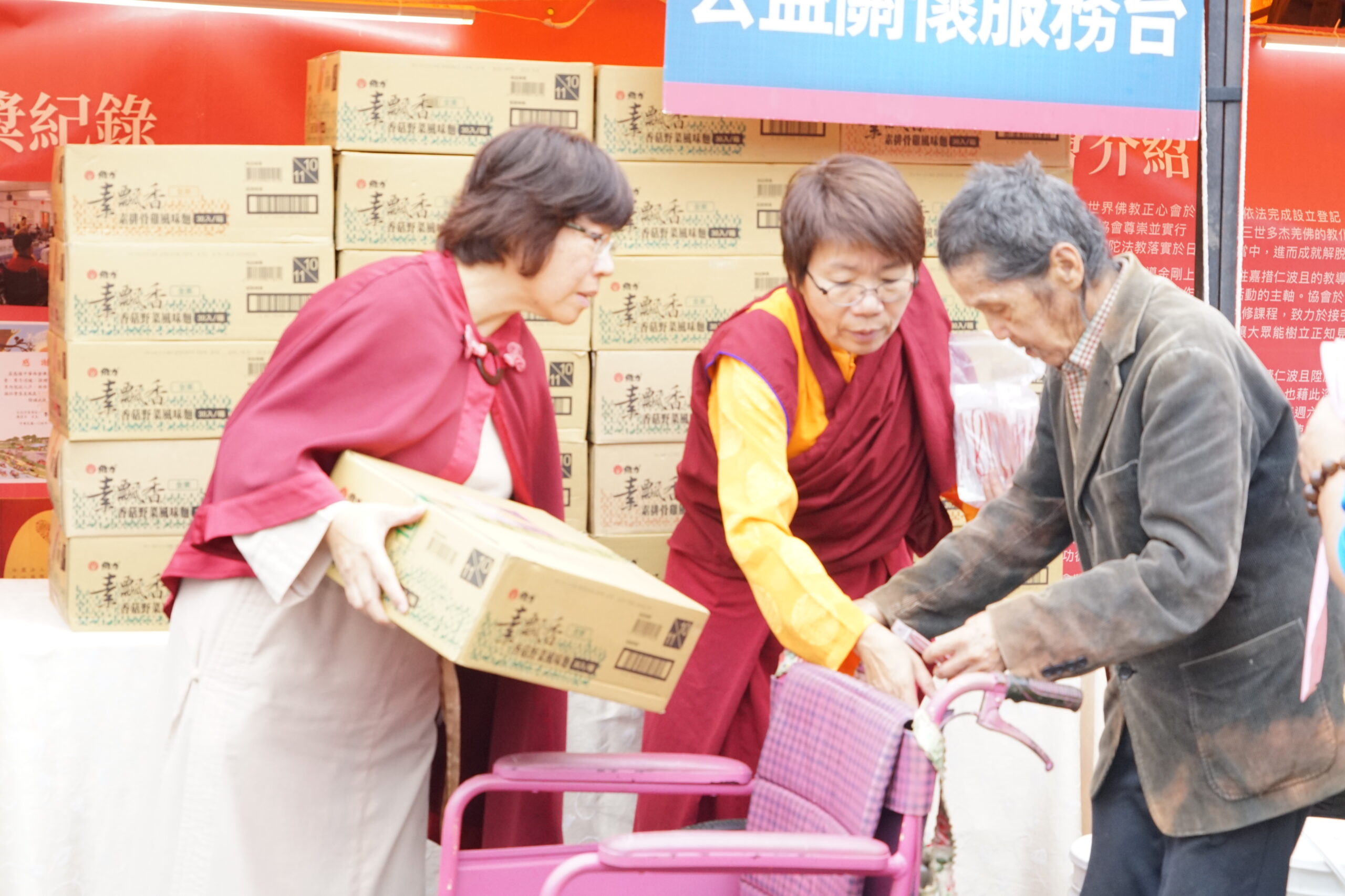 世界佛教正心會行動佛殿68站新竹關西潮音禪寺前廣場,弱勢家庭來到佛殿誦經後領取愛心物資,佛墜帶回與家人分享