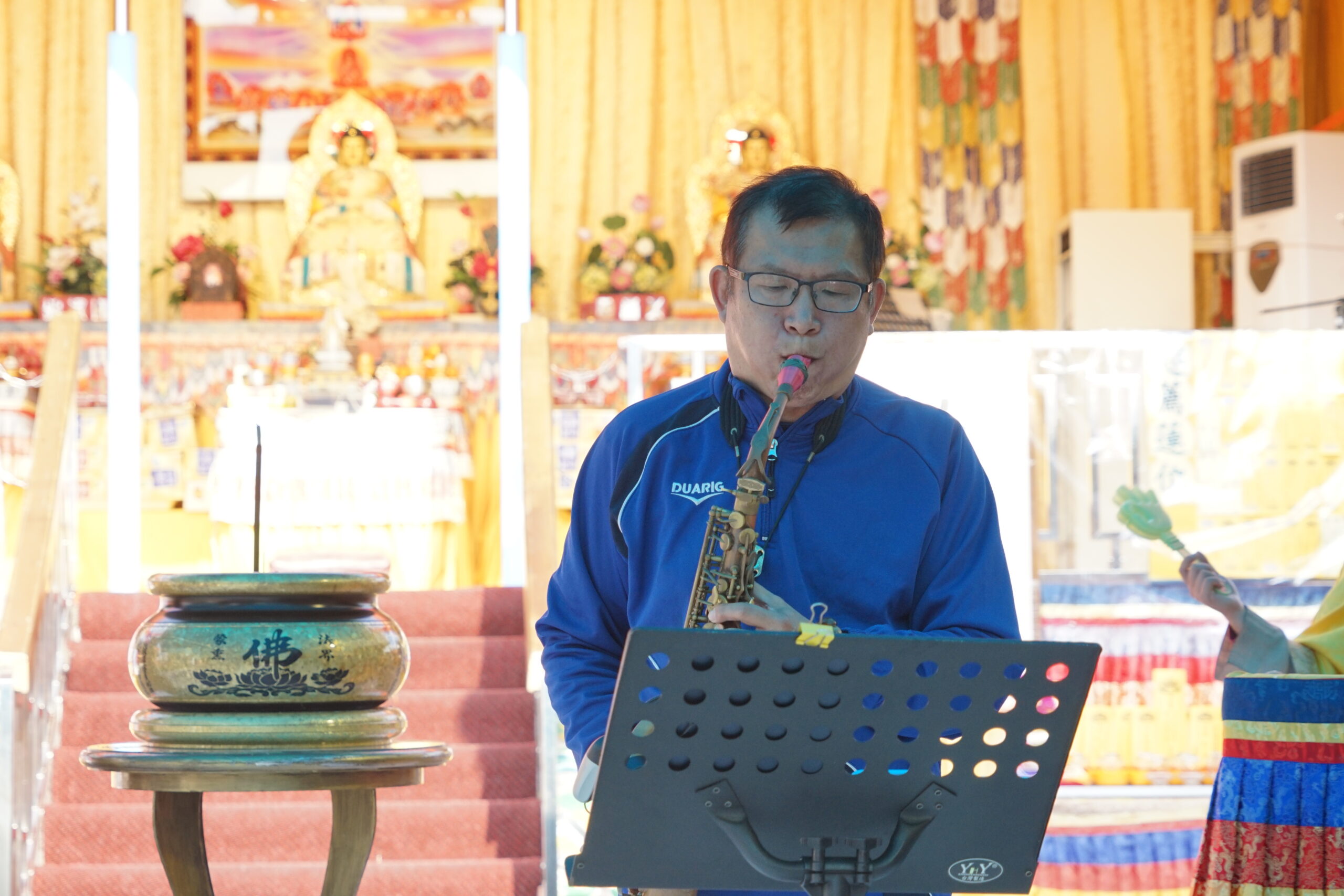2月9日邀請貴賓台中市議員王朝坤、后義宮主委賴永隆、義德里里長謝榮慶、舞之鼓太鼓團團長朱淑惠、無樂不奏樂團團長傅明山、豐太鼓團長李育茹等一同至佛殿祈福,祈請 南無第三世多杰羌佛 南無本師釋迦牟尼佛,為國泰民安、世界和平、眾生光明永昌祈福。