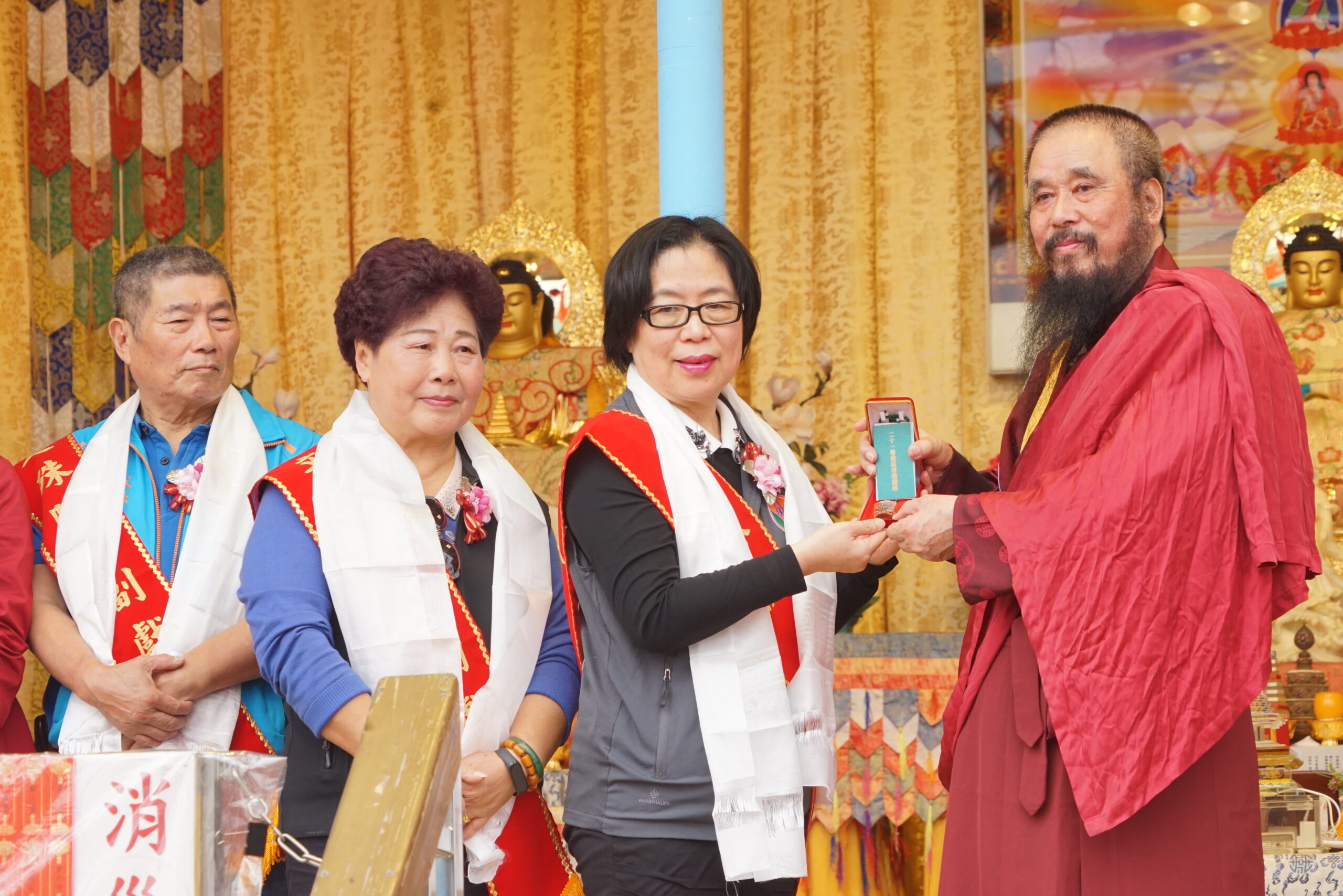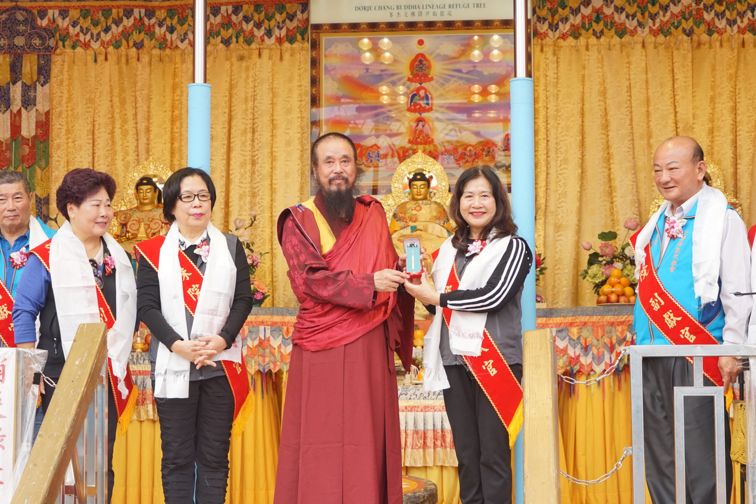 - 行動佛殿75站苗栗公館,本會指導上師恆性嘉措仁波且(右)致贈珍貴加持物綠度母墜子給苗栗政府民政處副處長林嫦娥(左),望大家都能恭誦聖號,讓疫情早日遠離
