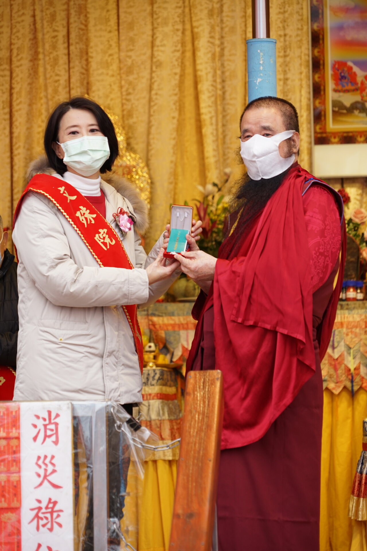 行動佛殿117站台北中正紀念堂,本會指導上師恆性嘉措仁波且(中)致贈珍貴加持物綠度母墜子給台北市議員王鴻薇(中左)