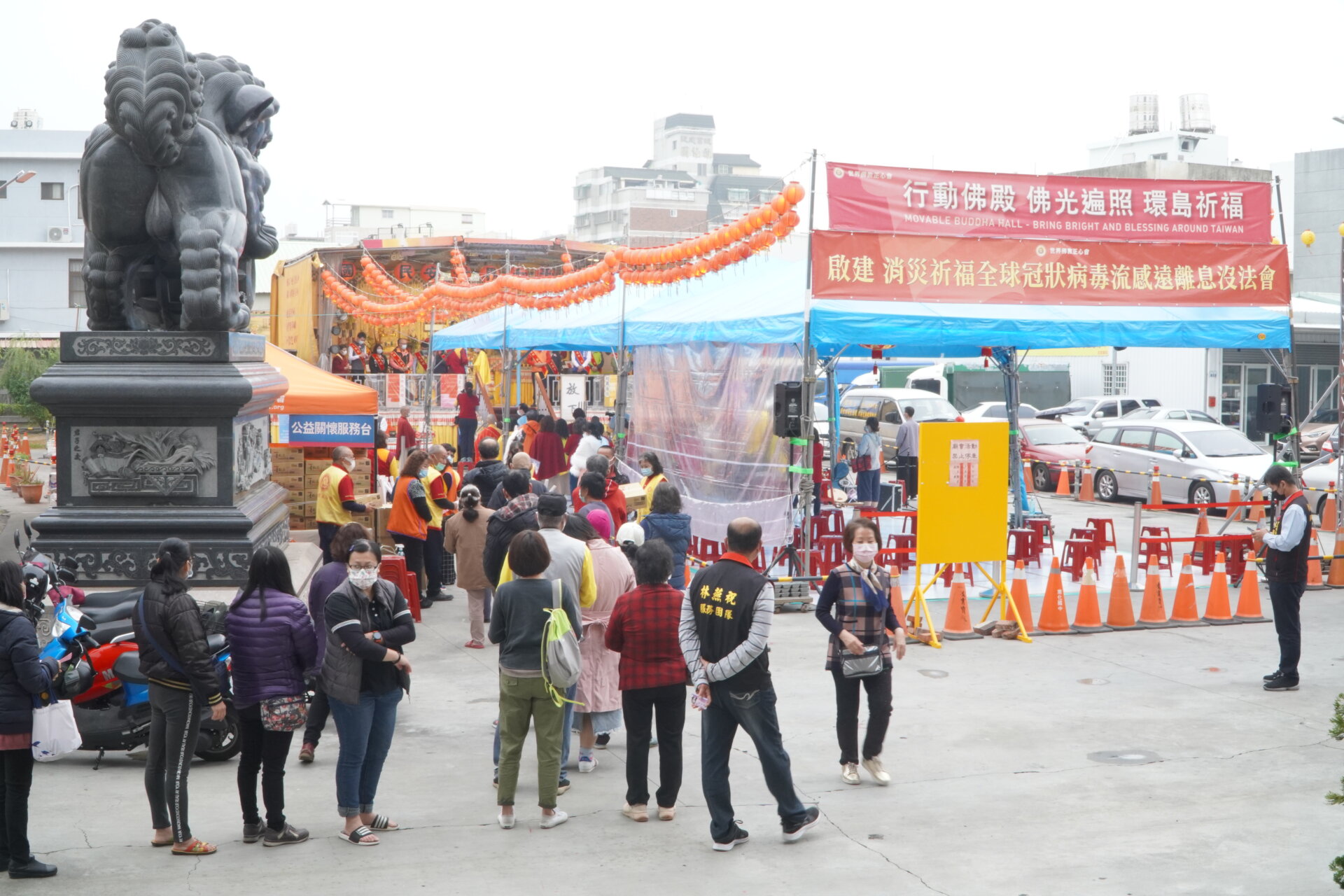 本會執行長陳和慧表示:在全球壟罩著新冠狀病毒疫情威脅下,行動佛殿所到之處皆恪守中央流行疫情指揮中心指示,出入口派駐義工把關,進出人員都必須要測量體溫,並以酒精噴灑雙手及鞋底消毒。每日打掃消毒環境,確保整潔。座位之間距離1公尺以上,工作人員全程配戴口罩,確實做好防疫措施。除了自身安全更募集十方愛心,發送愛心物資、口罩、酒精給當地弱勢及需要的民眾,讓更多人能夠一起做好防疫工作。