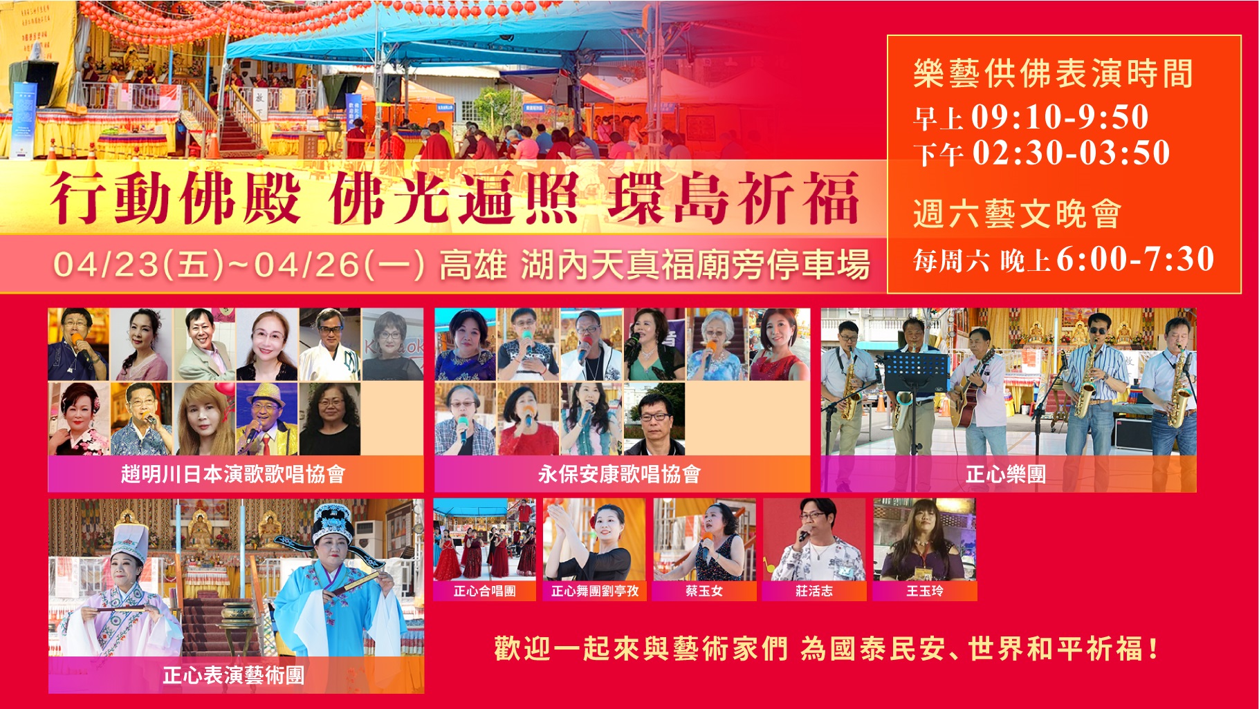 行動佛殿第133站抵達高雄湖內天真福廟前廣場,據悉天真福廟溯自明朝天啟4年,由田尾村謝氏先民從福建漳州渡台,奉福德正神金身來台。主祀盤古帝王、太陽真君、太陰真君,福德正神為當地信仰中心。4月24日周六行動佛殿祈福法會邀請正心表演藝術團、莊活志、王玉玲三位歌手獻聲演出,動人的歌聲讓蒞臨祈福的湖內區長薛茂竹、高雄市政府社會局機要秘書潘怡璋、黃明太議員助理李虹欣、立委邱志偉吳主任、市議員陳明澤曾秘書、市議員李亞筑康秘書等紛紛給予熱烈掌聲。