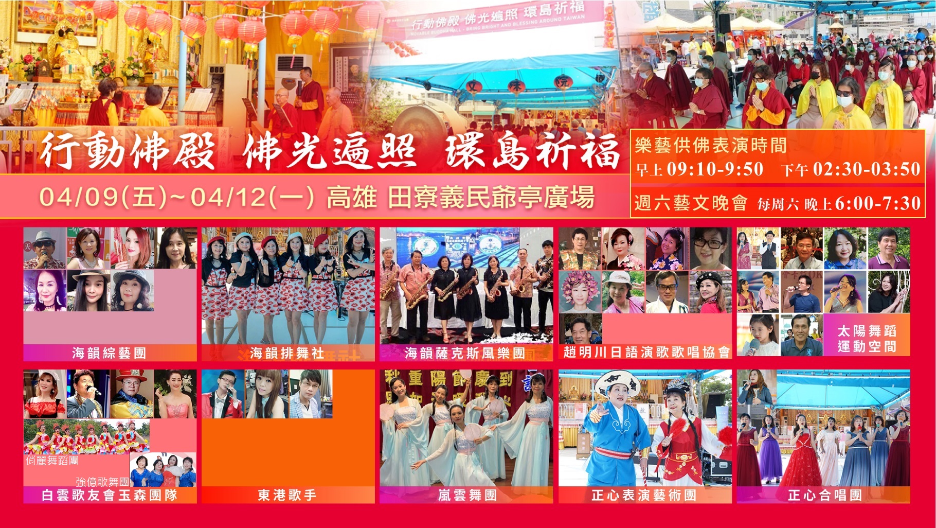 周末兩天本會邀請到眾多知名表演團體,如:太陽舞蹈運動空間、嵐雲舞團、趙明川日語演歌歌唱協會、東港3位歌手、白雲歌友會玉森團隊、俏麗舞蹈團、強億歌舞團、海韻綜藝團、海韻薩克斯風樂團、海韻排舞社齊至行動佛殿以優美音樂舞蹈樂藝供佛,邀請在地鄉親共同觀賞,欣賞精彩節目,跟著音樂,大聲歌唱,享受美好下午時光。更可以到行動佛殿禮拜諸佛菩薩,瞻禮佛陀舍利,與大眾一同誦經祈福。行動佛殿將在高雄巡迴各大小鄉鎮,敬邀信眾參加。