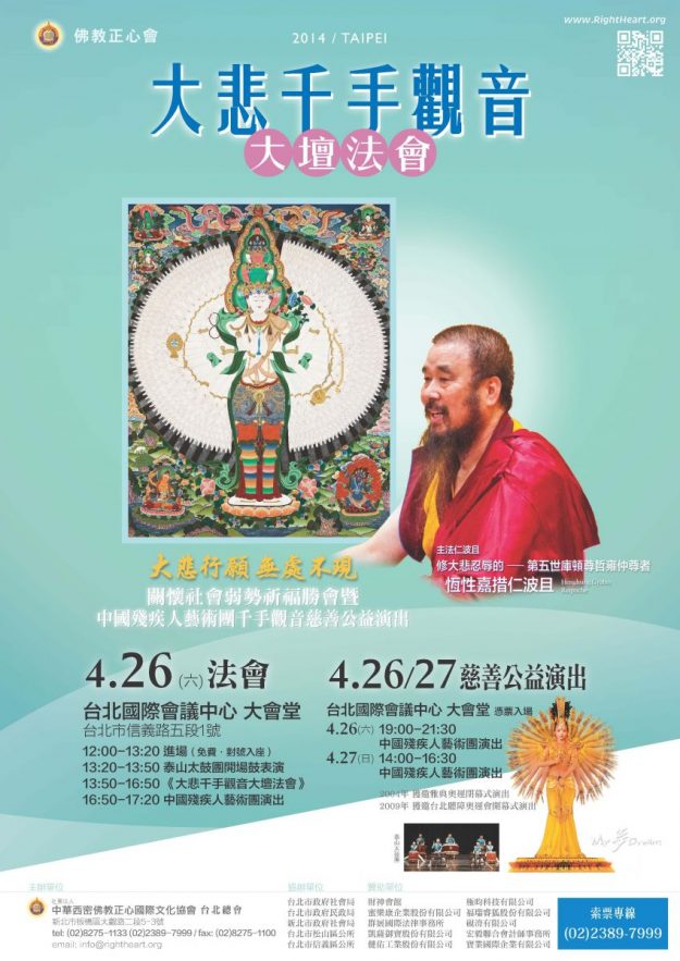 2014 年台北「大悲千手觀音大壇法會」 公益, 法會, 活動由 編輯室 發佈2014-04-26本會於2014年4月26日於台北TICC國際會議中心舉辦「大悲千手觀音大壇法會大悲行願無處不現關懷社會弱勢祈福勝會暨中國殘疾人藝術團千手觀音慈善公益演出」順利圓滿