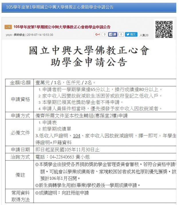 2016年國立中興大學佛教正心會助學金申請公告 公益由 編輯室 發佈2016-07-14由本會提供之國立中興大學助學金申請,協助家中收入因變故銳減致生活困苦或低收入戶學子能安心就學,減輕家庭負擔。符合資格者,請逕向該校生輔組辦理申請。