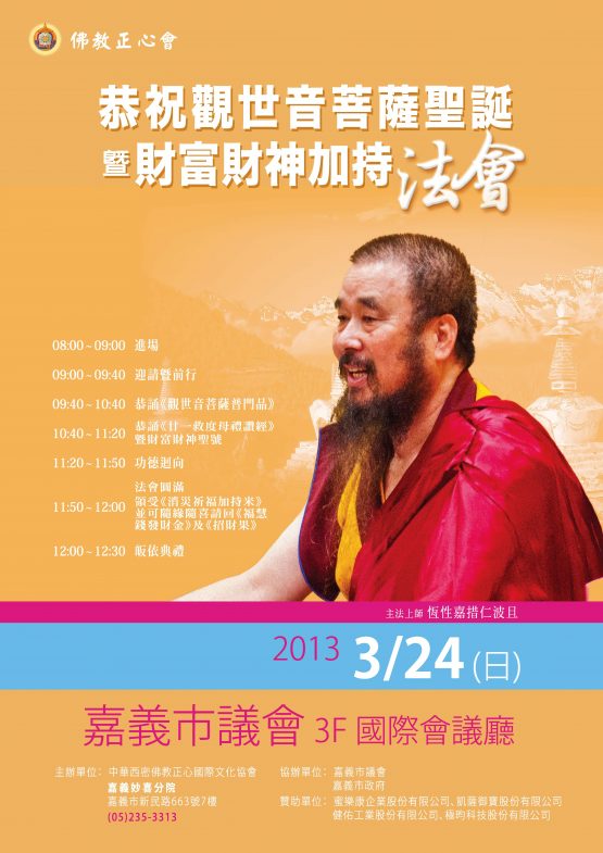 閱讀全文本會於2013年05月10日於新北市八里舉行「恭祝 第三世多杰羌佛及釋迦世尊聖誕放流法會」,下午於板橋正心總會舉辦「釋迦世尊聖誕法會」
